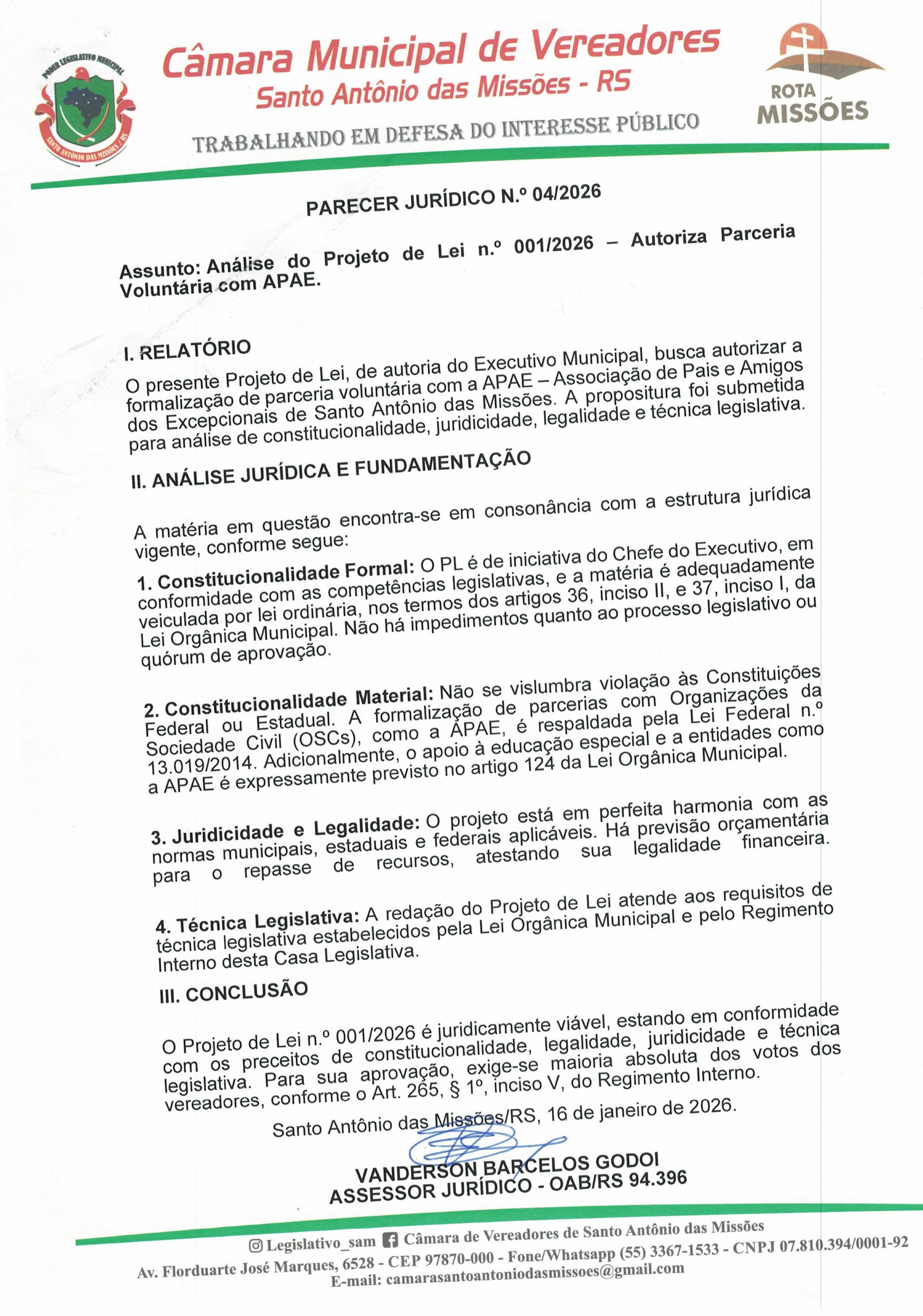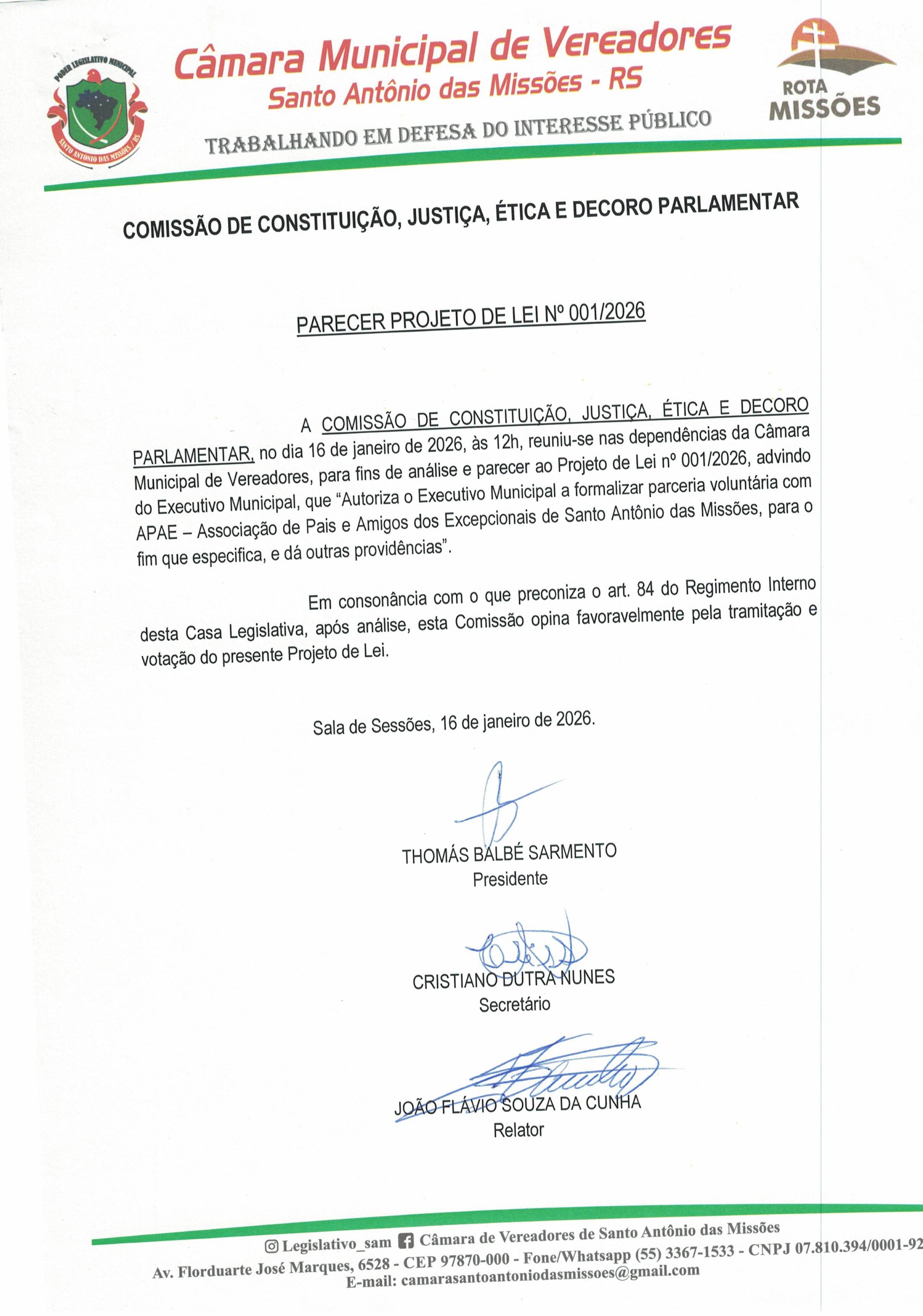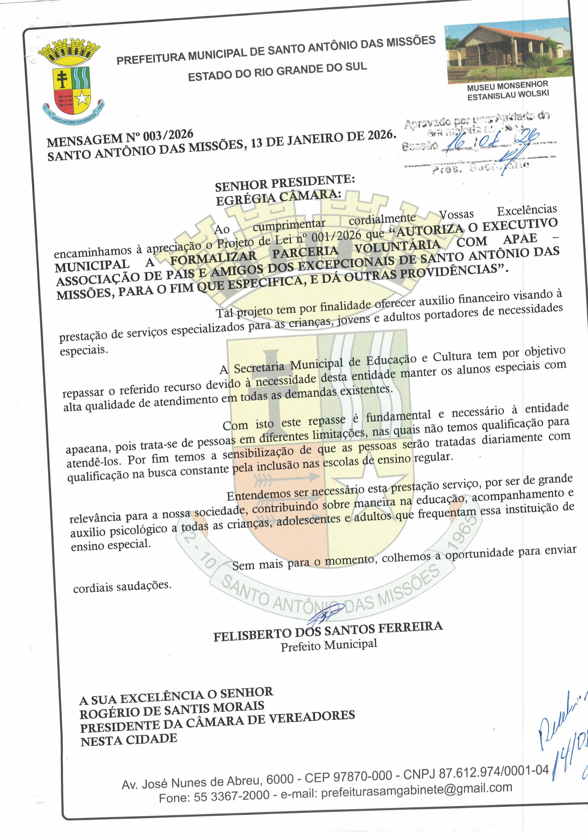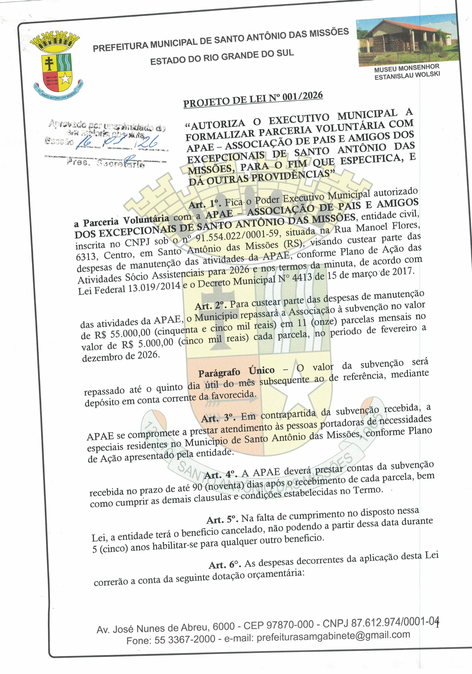 Projeto de lei 001/2026 Autoriza o Executivo Municipal a formalizar parceria voluntaria com APAE associaçao de Pais e amigos do expecionais de Santo Antonio das Missões,parao fim que especifica,e dá outra providência.